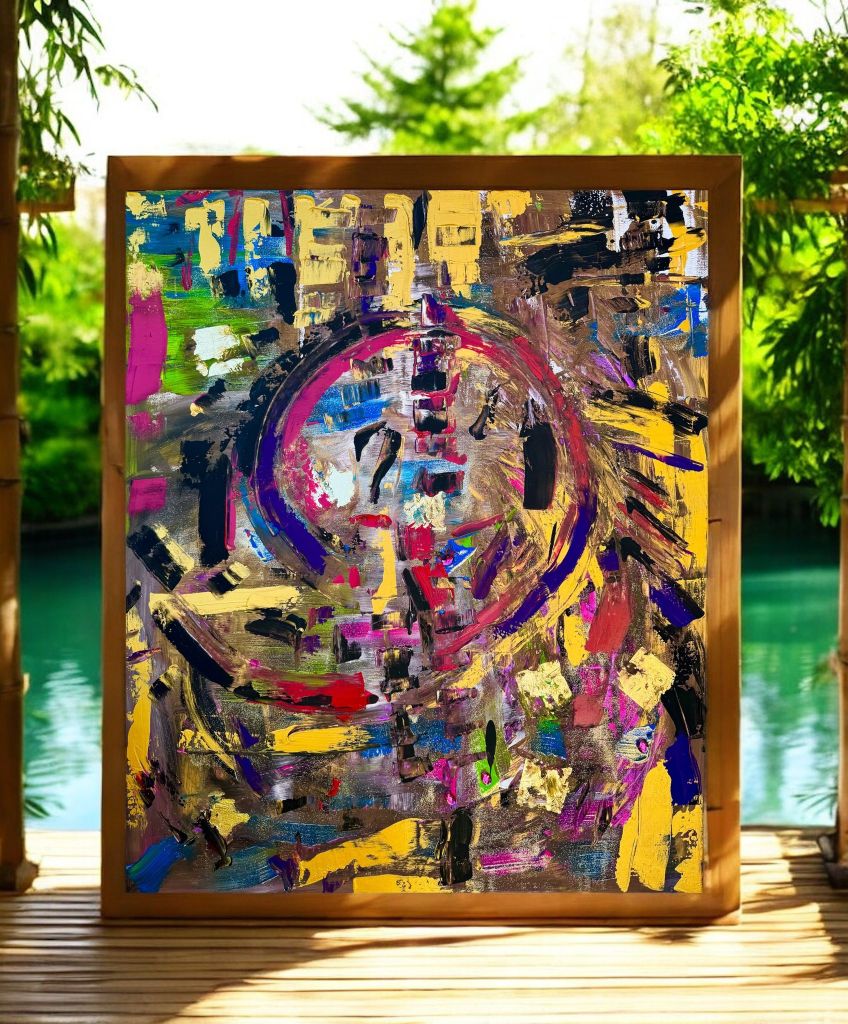 Il gesto pittorico non è costruito. È selvaggio e sacro, come un tamburo battuto in trance. Ogni pennellata sembra arrivare da un luogo senza tempo, forse canalizzata, forse evocata. Come se la stessa tela avesse invocato di essere abitata da quel simbolo centrale.